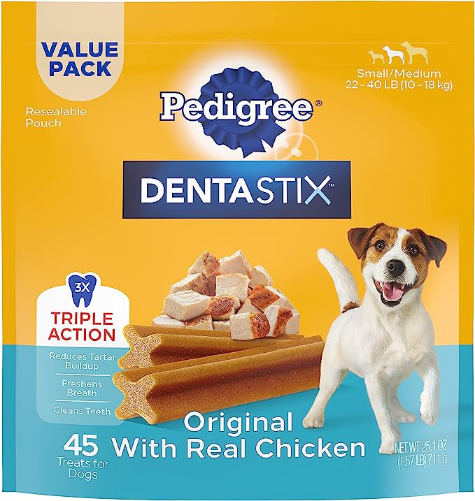 Treat your dog to PEDIGREE DENTASTIX Small/Medium Dental Treats for dogs, the perfect snack that adds a delicious chicken flavored boost to your dog’s oral care routine. Formulated for small and medium dogs, the chewy texture and unique X-shape design in these healthy dog treats is clinically proven to reduce plaque and tartar buildup, so treat time is part of a healthy dental care routine that helps promote canine oral health too!