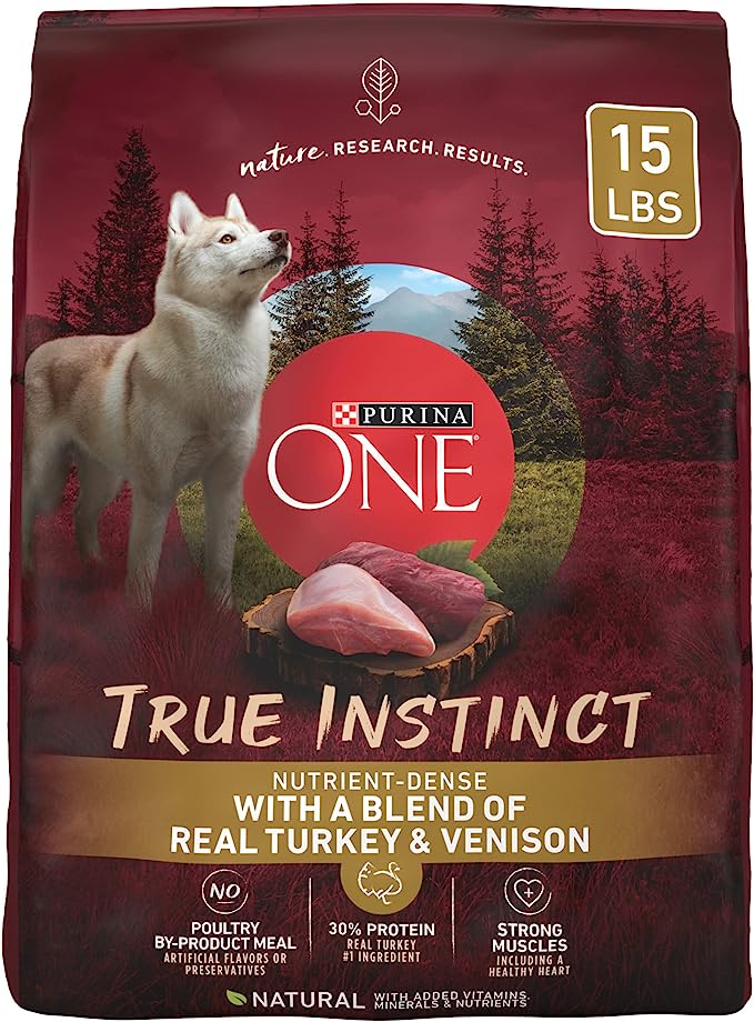 Give your dog the taste he craves with Purina ONE True Instinct With a Blend Of Real Turkey and Venison adult natural dry dog food with added vitamins, minerals and nutrients. With 100 percent nutrition and 0 percent fillers, every ingredient in this Purina dog food has a purpose. We start our high protein dog food recipe with real turkey as the number 1 ingredient and include real venison. They help to deliver 30 percent protein, which helps support your active dog’s strong muscles. We also craft our high quality dog food with added vitamins, minerals and nutrients and with no poultry by-product meal or artificial flavors or preservatives. This recipe also features natural sources of glucosamine to support joint health for dogs. A crunchy kibble texture and added calcium helps support his strong teeth and healthy gums. With natural nutrition backed by research and crafted by a veterinarian-recommended brand, Purina ONE True Instinct With Real Turkey and Venison dog food keeps you and your dog happy.